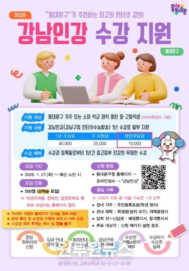(원투원뉴스) 서울 동대문구는 관내 중·고등학생의 사교육비 부담을 덜고 자기주도 학습 기반을 넓히기 위해 ‘강남인강(강남구청 인터넷수능방송) 수강 지원 사업’을 2026년에도 이어간다고 밝혔다.