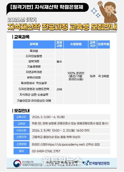(원투원뉴스) 지식재산처 국제지식재산연수원은 한국발명진흥회와 공동으로 2월 5일부터 23일까지 지식재산학 학점은행 과정에 대한 온라인 수강생을 모집한다.