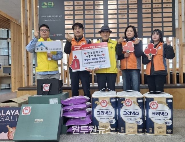 (원투원뉴스) 세종특별자치시 소담동지역사회보장협의체(공동위원장 허문선·배병국)가 5일 설 명절을 앞두고 한국전력공사 세종전력지사(지사장 김진우)로부터 위문품을 기탁 받았다.