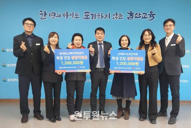 (원투원뉴스) 원서영노인복지간병센터와 산마루나드리산악회가 5일 울산강북교육지원청을 방문해 취약‧위기 학생 지원을 위한 후원금 240만 원을 기탁했다.