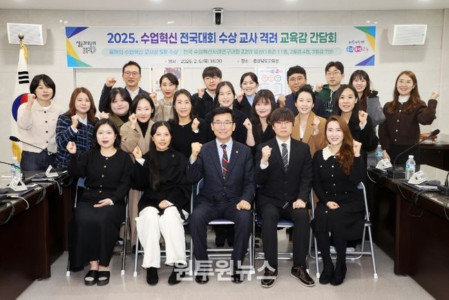 (원투원뉴스) 충청북도교육청은 5일, 2025학년도 수업혁신 분야 전국대회 수상 교사를 초청해 교육감실에서 간담회를 열고, 교실수업 혁신성과를 거둔 교사들을 격려했다.