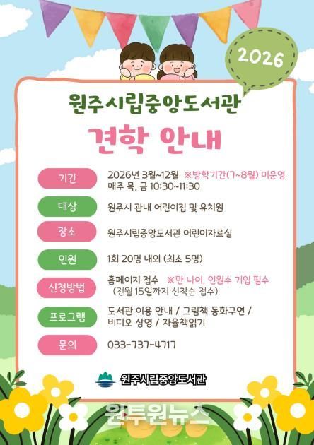 (원투원뉴스) 원주시립중앙도서관은 오는 3월부터 12월까지 관내 유치원과 어린이집을 대상으로 도서관 견학 프로그램을 운영한다.