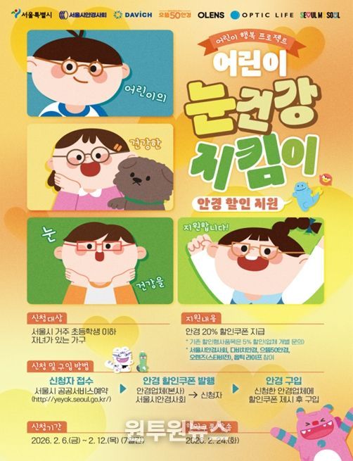 (원투원뉴스) 서울시가 새 학기를 맞아 스마트폰 등 디지털 기기를 자주 접하는 어린이들의 눈 건강을 위해 눈 검진(시력검사)과 최대 20%의 안경 구입 할인을 지원하는 ‘서울 어린이 눈건강 지킴이 사업’ 1차 신청을 받는다.