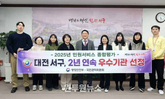 (원투원뉴스) 대전 서구는 행정안전부와 국민권익위원회가 공동 주관한 ‘2025년 민원서비스 종합평가’에서 우수 등급인 ‘나’등급을 획득해, 지난해에 이어 2년 연속 우수기관으로 선정됐다.