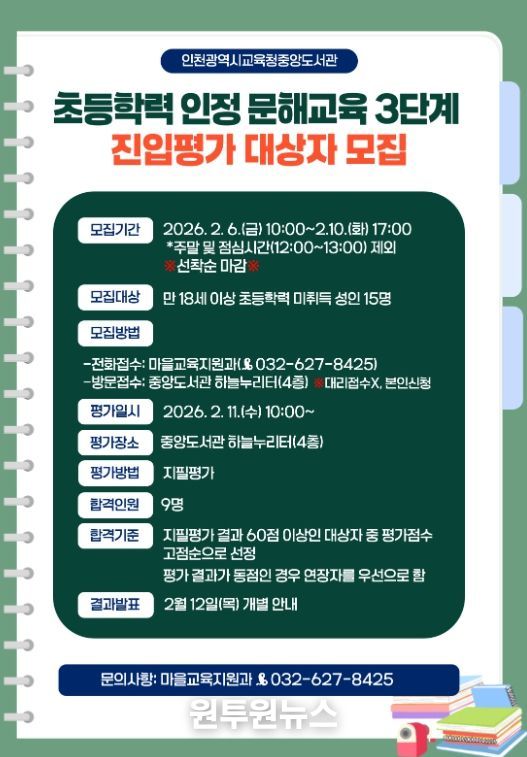 (원투원뉴스) 인천광역시교육청중앙도서관은 초등 학력을 취득하지 못한 성인의 학력 취득 기회 제공을 위하여, ‘2026년 초등학력 인정 문해교육 3단계 진입평가’ 대상자를 모집한다.