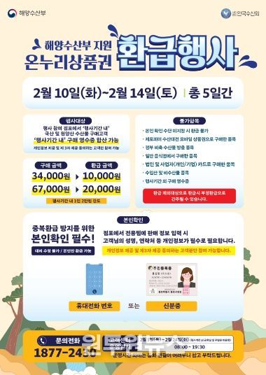 (원투원뉴스) 해양수산부가 주최하는 ‘수산물 온누리상품권 환급 행사’가 오는 2월 10일부터 14일까지 5일간 영덕전통시장 및 강구시장에서 진행된다.