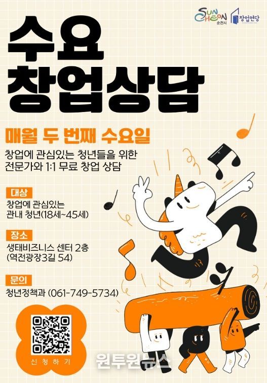(원투원뉴스) 순천시가 창업에 어려움을 겪는 청년 창업자와 예비 창업자를 대상으로 '2026년 수요창업상담'을 연중 운영한다.