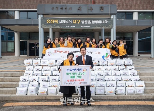 (원투원뉴스) 인천광역시 서구는 지난 5일 호박봉사단(단장 최정옥)으로부터 설명절 먹거리 꾸러미 150박스를 전달받았다.