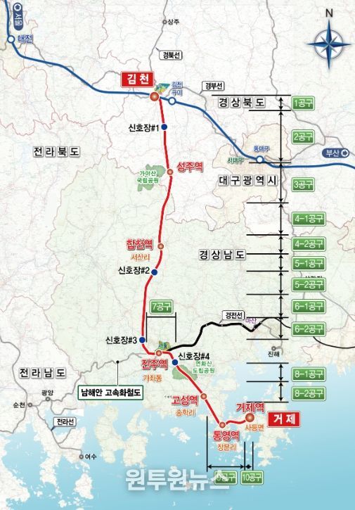 남부내륙철도는 현재 전체 14개 공구 중 10개 공구에 대해 시공 계약을 완료했다. 10공구는 기본설계 기술제안 방식으로 추진 중이며, 나머지 3개 공구(1·7·9공구)는 상반기 중 실시설계 기술제안 방식으로 공고될 예정이다.