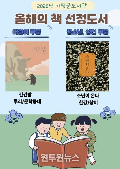 (원투원뉴스) 가평군도서관이 군민의 독서 문화 확산을 위해 ‘2026년 올해의 책’으로 루리 작가의 『긴긴밤』과 한강 작가의 『소년이 온다』를 선정했다.