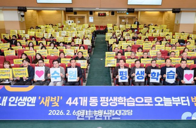 수원시는 6일 시청 대강당에서 ‘2026 수원시 평생학습 시민 설명회’를 열고, 올해 새롭게 동 평생학습센터 사업에 참여하는 34개 동에 현판을 전달했다.