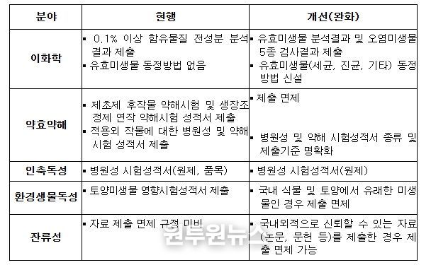 또한, 이화학 분야에서는 유효 미생물 동정 방법과 오염 미생물 범위를 정했고, 약효 약해 분야에서는 병원성 시험의 방법과 기준을 명확하게 했다. 독성 분야에서는 원제와 품목 모두 제출했던 병원성 시험에서 원제만 제출하도록 완화했다. 토양미생물영향시험은 국내 유래 미생물은 면제하고, 국내외적으로 신뢰할 수 있는 자료를 제출하면 시험성적서를 대체할 수 있도록 했다.