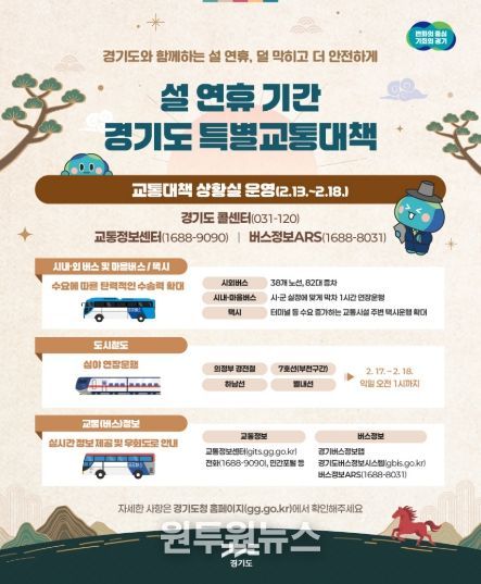 (원투원뉴스) 경기도가 안전하고 편한 설 귀성길 조성을 위해 13일부터 18일까지 6일간을 ‘2026년도 설 연휴 특별교통대책기간’으로 정하고 시외버스 증차, 도로정보 실시간 안내, 긴급도로 복구 체계 구축 등 적극 대응한다.