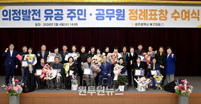 (원투원뉴스) 광주 북구의회는 지난 4일, 지역사회 발전에 헌신한 유공자들의 공로를 기리기 위해 2026년도 새해 첫 정례표창 수여식을 개최했다.
