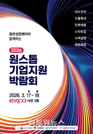 (원투원뉴스) 대구광역시는 지역기업의 지속 가능한 성장을 지원하기 위해 오는 3월 17일부터 18일까지 EXCO 서관 3층에서 열리는 ‘동반성장페어와 함께하는 2026 원스톱 기업지원박람회’ 참가기업을 모집한다.
