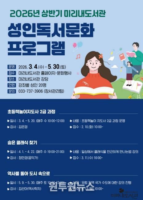 (원투원뉴스) 원주시 미리내도서관은 시민들의 문화 접근성을 높이기 위해 성인을 대상으로 상반기 독서문화 프로그램을 운영한다.