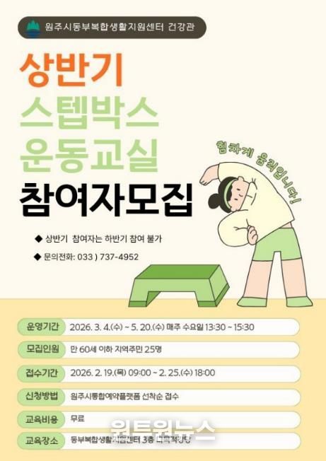 (원투원뉴스) 원주시 동부복합생활지원센터는 오는 19일부터 25일까지 상반기 ‘스텝박스 운동 교실’ 참여자를 모집한다.
