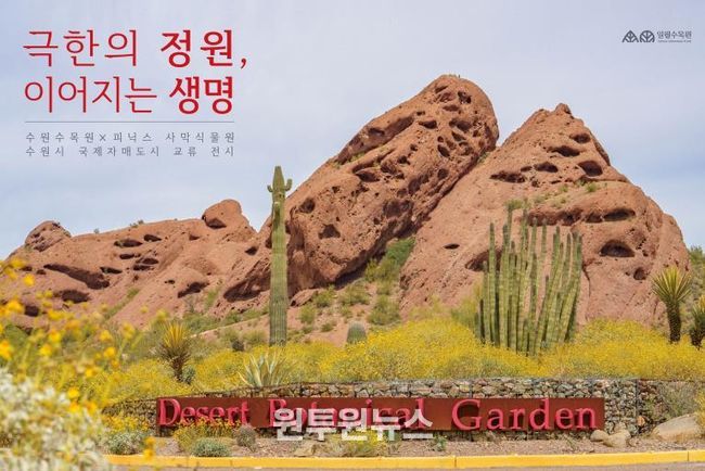 (원투원뉴스) 수원수목원은 3월 22일까지 일월수목원 방문자센터 1층에서 수원시 국제자매도시인 피닉스시의 피닉스 사막식물원을 소개하는 사진전 ‘극한의 정원, 이어지는 생명(미국 피닉스 사막식물원 사진전)’을 연다.