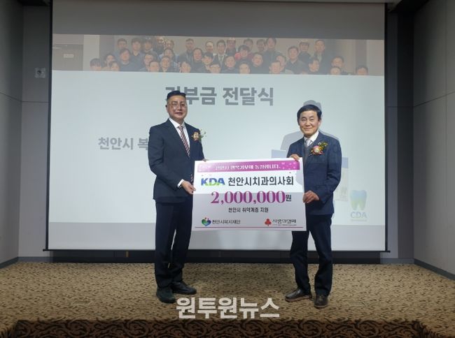 (원투원뉴스) (재)천안시복지재단은 천안시치과의사회가 지난 6일 열린 정기총회에서 취약계층을 위한 후원금 200만 원을 기탁했다고 밝혔다.