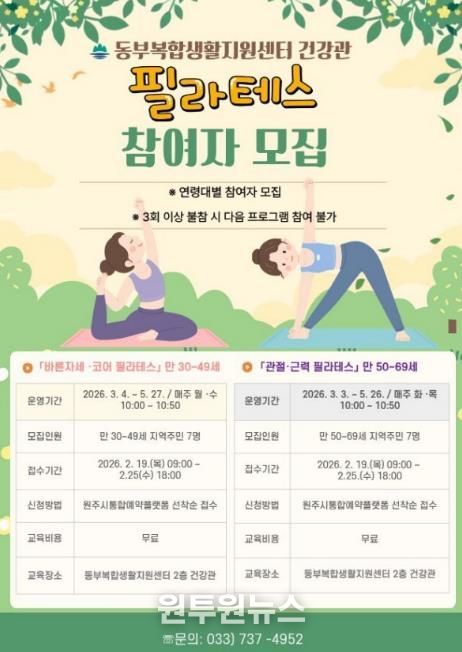 (원투원뉴스) 원주시 동부복합생활지원센터 건강관은 오는 19일부터 중·장년을 대상으로 한 필라테스 프로그램 참여자를 모집한다.
