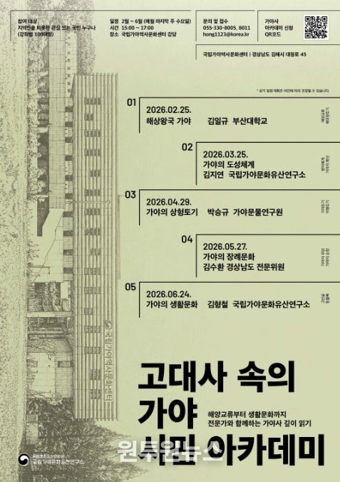 (원투원뉴스) 국가유산청 국립문화유산연구원 국립가야문화유산연구소는 2월부터 6월까지 매월 마지막 주 수요일, 국립가야역사문화센터 강당(경남 김해시)에서 시민들을 대상으로 '고대사 속의 가야' 시민 아카데미를 개최한다.
