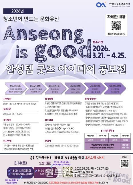 (원투원뉴스) 안성시청소년수련관은 청소년이 지역 문화유산을 창의적인 굿즈로 재해석하는 '2026 청소년이 만드는 문화유산 ‘안성템 굿즈 아이디어 공모전’'을 개최하고, 오는 3월부터 참가 청소년을 모집한다고 밝혔다.