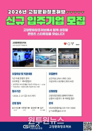 신청은 고양문화창조허브 전자우편으로 가능하며, 평가를 거쳐 3월 중 최종 기업을 선정해 4월부터 입주할 예정이다.