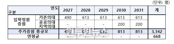 (원투원뉴스) 보건복지부는 2월 10일 오후 2시, 정부서울청사(서울 종로구 소재)에서 제7차'보건의료정책심의위원회'(이하 보정심)를 개최하여 지역․필수․공공의료 강화를 위해 서울을 제외한 32개 의과대학을 대상으로 2027년부터 2031년까지 의사인력 양성 규모를 연평균 668명 늘리기로 결정했다. 기존 의대 증원 인원 중 2024학년도 정원(3,058명)을 초과하는 부분은 모두 지역의사로 선발된다. 또한 증원 초기 의학교육 현장의 부담을 완화하기 위하여 단계적으로 증원을 추진한다.