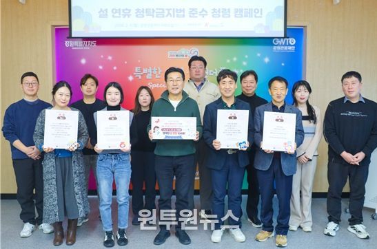 (원투원뉴스) 강원관광재단은 지난 9일 설 명절을 앞두고 공직사회의 청렴 문화 확산과 청탁금지법 준수 의식 제고를 위해 청탁금지법 준수 청렴 캠페인을 실시했다.