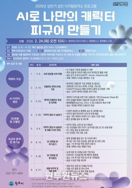 (원투원뉴스) 원주시 샘마루도서관은 서부권 시민들의 디지털 창작 역량 증진을 위해 오는 3월부터 ‘상반기 성인 디지털창작소 프로그램’을 운영한다.