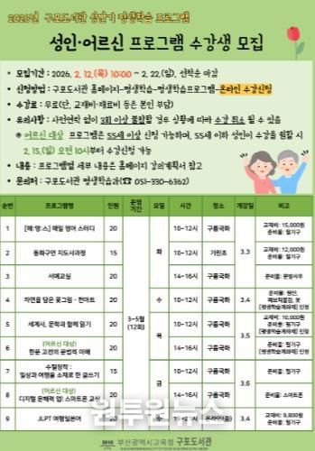 (원투원뉴스) 부산광역시립구포도서관은 오는 3월부터 5월까지 관내 지역 주민들을 대상으로 2026년 상반기 ‘평생학습 프로그램’을 운영한다고 밝혔다.