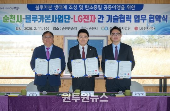 (원투원뉴스) 순천시는 11일 순천만습지에서 서울대 블루카본사업단, LG전자(주)와 함께 '블루카본 생태계 조성 및 탄소중립 공동 이행을 위한 업무협약'을 체결했다고 밝혔다.