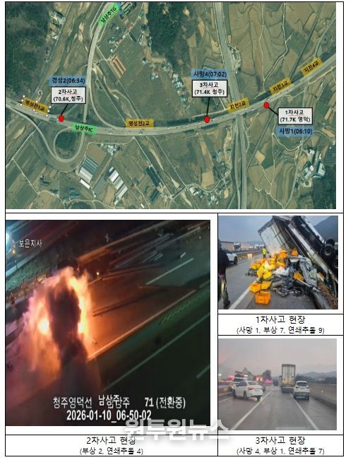 주요 지적사항으로는,한국도로공사 보은지사의 경우, ’26. 1. 10. 당시 사고 구간에 사고 발생 이전부터 강우로 인해 노면이 젖어 있었고, 노면온도가 영하로 떨어질 것으로 예보되어 도로 살얼음 발생이 예상되는 상황이었음에도, 기상 상황에 대한 판단 착오로 사고 구간에 제설제 예비살포를 실시하지 않은 것으로 나타났다.