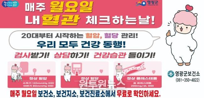 (원투원뉴스) 영광군은 심뇌혈관질환 예방을 위해 매주 월요일을‘혈관 건강 체크하는 날’로 지정해 오는 2월 23일부터 본격 추진한다고 밝혔다.