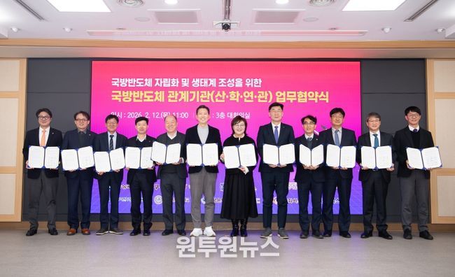 시는 12일 시청 대회의실에서 경상북도와 한국과학기술연구원(KIST), 서울대학교 반도체공동연구소, 포항공과대학교, 나노융합기술원, DGIST차세대센서·반도체연구소, 국립금오공과대학교, 경운대학교 등 주요 연구·교육기관과 KEC, 한화시스템, LIG넥스원 등 반도체·방산 기업이 참여한 가운데 '국방반도체 자립화 및 생태계 조성을 위한 업무협약'을 체결했다. 산·학·연·관 12개 기관이 참여한 이번 협약은 기술 자립을 위한 공동 대응의 출발점이 됐다.