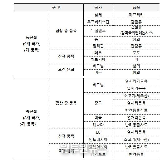 ① 딸기(브라질), 단감(중국), 포도(필리핀), 쇠고기·돼지고기(싱가포르), 반려동물사료(베트남·인도네시아), 필리핀(열처리돈육가공품) 등