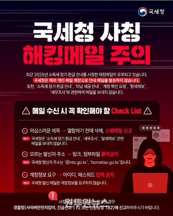 최근 2026년 소득세 정기 환급 안내를 사칭한 해킹메일이 유포되고 있습니다. 국세청은 해외 개인 메일 계정으로 안내 메일을 발송하지 않습니다. 또한, '소득세 정기 환급 안내', '미납 세금 안내', '계정 확인 요청', '탈세제보', '세무조사'와 관련하여 메일을 보내지 않습니다.