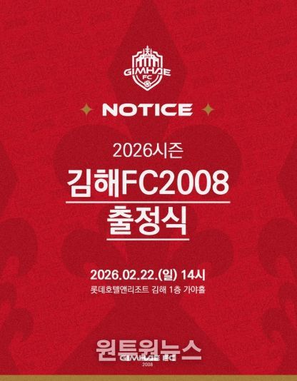 (원투원뉴스) K리그2 무대에 첫 도전장을 내미는 김해FC2008(이하 김해FC)이 오는 22일 오후 2시, 롯데호텔앤리조트 김해에서 ‘2026시즌 출정식’을 개최한다.
