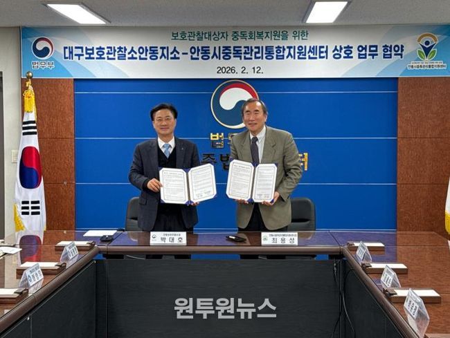 (원투원뉴스) 안동시중독관리통합지원센터와 법무부 대구보호관찰소 안동지소는 보호관찰 대상자의 중독 예방과 치료, 재활 및 사회복귀를 지원하고 지역사회 범죄 예방에 기여하기 위해 2월 12일 업무협약을 체결했다.