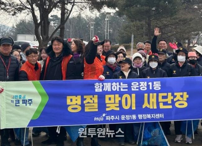(원투원뉴스) 파주시 운정1동은 민족 최대의 명절인 설을 앞두고 깨끗하고 쾌적한 도시 환경을 조성하기 위해 지난 12일, 와동동 1390번지 일대 도로변에서 녪년 설맞이 일제 대청소’를 실시했다.