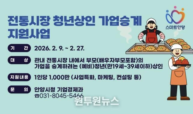 (원투원뉴스) 안양시가 전통시장에 젊은 활력을 불어넣고 청년 상인의 안정적인 정착을 돕기 위해 ‘2026년 전통시장 청년상인 가업승계 지원사업’을 추진한다고 13일 밝혔다.