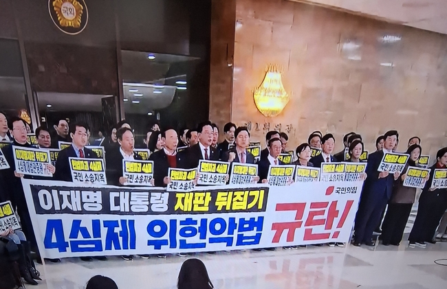 국회 본회의장 앞 로텐더홀에 모인 국민의힘 의원들은 '헌법파괴 4심제 국민 소송 지옥', '이재명 재판 뒤집기 4심제 대법관 증원 규탄' 문구가 적힌 손팻말을 들고 "민주당은 4심제, 대법관 증원 철회하라", "이재명 정권 방탄 법안 강행 처리 규탄한다" 등 구호를 외쳤다.