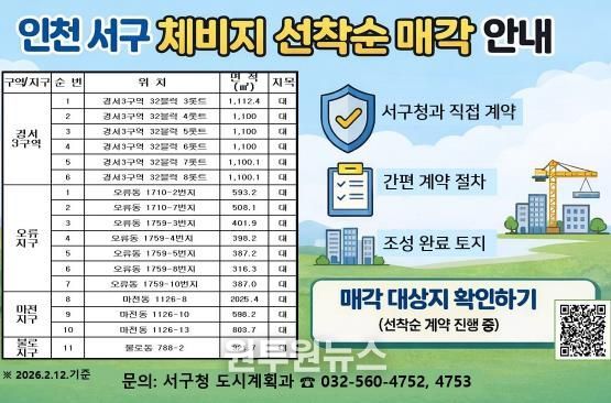서구 관계자는 “이번 매각 대상 체비지는 개발이 완료된 지구 내 토지로 활용도가 높고, 행정기관과 직접 계약하는 방식이어서 절차의 안정성과 투명성이 높다”라며 “주거용 부지 마련이나 사업 부지를 찾는 수요자에게 실질적인 선택지가 될 것으로 기대한다”라고 말했다.