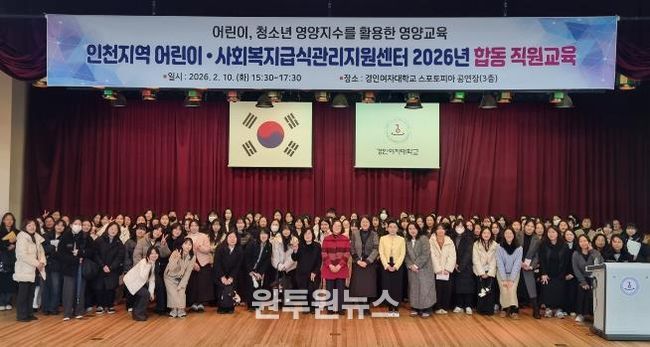(원투원뉴스) 인천광역시 서구가 위탁 운영하는 인천서구 어린이·사회복지급식관리지원센터는 인천지역 거점센터로서 지난 10일 경인여자대학교 스포토피아 공연장에서 ‘어린이, 청소년 영양지수를 활용한 영양교육’을 주제로 2026년 인천지역 합동 직원교육을 실시했다.