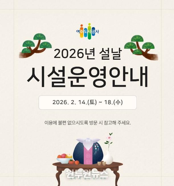 (원투원뉴스) 여주도시공사가 다가오는 2026년 설 연휴를 맞아 시민과 귀성객들이 안전하고 편안한 명절을 보낼 수 있도록 주요 시설 운영시간 조정 및 특별 서비스를 시행한다고 밝혔다.