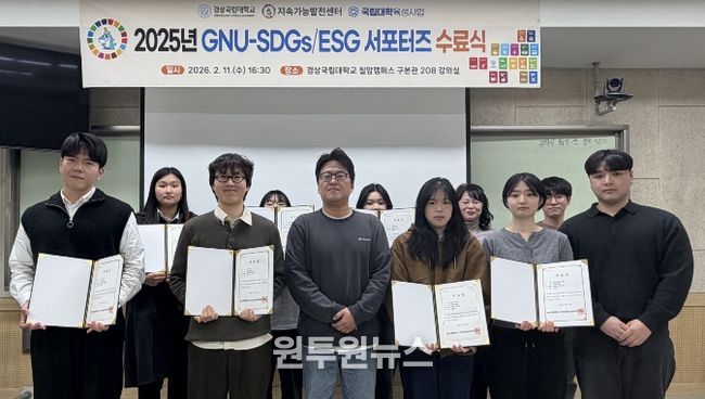 (원투원뉴스) 경상국립대학교 지속가능발전센터는 2월 11일 칠암캠퍼스에서 ‘2025년 GNU-SDGs/ESG 서포터즈 수료식’을 개최했다.