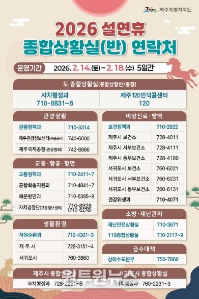 제주도는 14일부터 18일까지 특별자치행정국장을 총괄로, 총 7개반 1,491명을 투입해 종합상황실을 운영한다.
