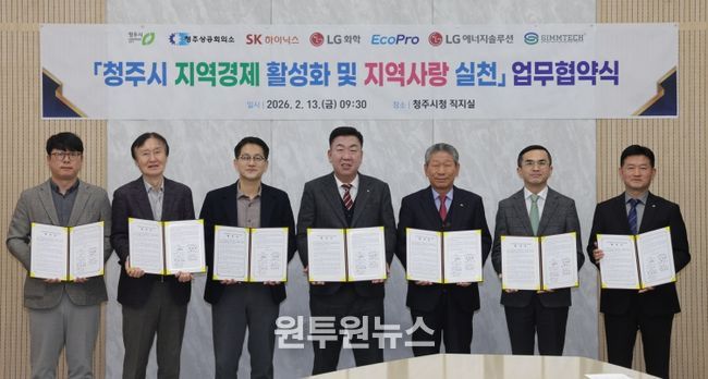 이날 협약식에는 이범석 청주시장과 차태환 청주상공회의소 회장, 박호현 SK하이닉스㈜ 부사장, 김영대 ㈜LG화학 청주공장 대외협력팀장, 최상운 에코프로 부사장, 김용술 ㈜LG에너지솔루션 오창주재임원, 이규득 ㈜심텍 상무가 참여했다.