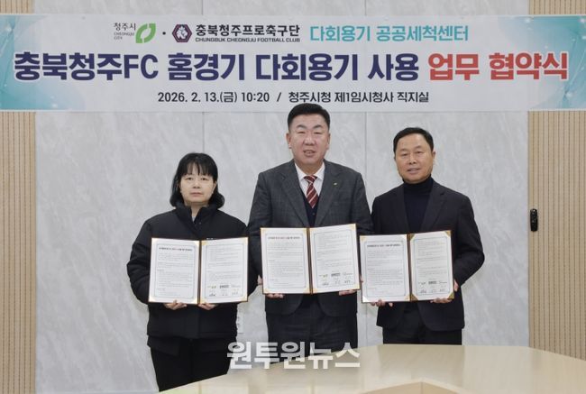 (원투원뉴스) 청주시는 13일 충북청주 프로축구단(충북청주FC), 다회용기 공공세척센터와 함께 충북FC 홈경기 다회용기 사용 확대를 위한 업무협약을 체결했다.