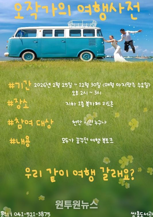 (원투원뉴스) 천안시 쌍용도서관은 문화가 있는 날을 맞아 여행 강연 프로그램 ‘오작가의 여행 사전’을 운영한다고 19일 밝혔다.